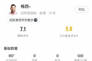 体育资讯10月01日讯 美职联常规赛,迈阿密国际3-5芝加哥。梅西本场比赛没有收获进球助攻,评分7.1。