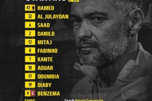 吉达联合首发:47-哈麦德、32-朱莱丹、6-萨德-穆萨、2-达尼洛、12-米塔赫、8法比尼奥、7-坎特、10-奥亚尔、17-敦比亚、19-迪亚比、9-本泽马