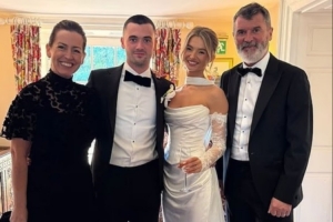 体育资讯10月30日讯 据《太阳报》报道,曼联传奇罗伊-基恩的儿子艾丹上周末举行了婚礼。基恩在社媒分享了一张家庭合影,照片中他身穿燕尾服与妻子特蕾莎和新婚夫妇站在一起。